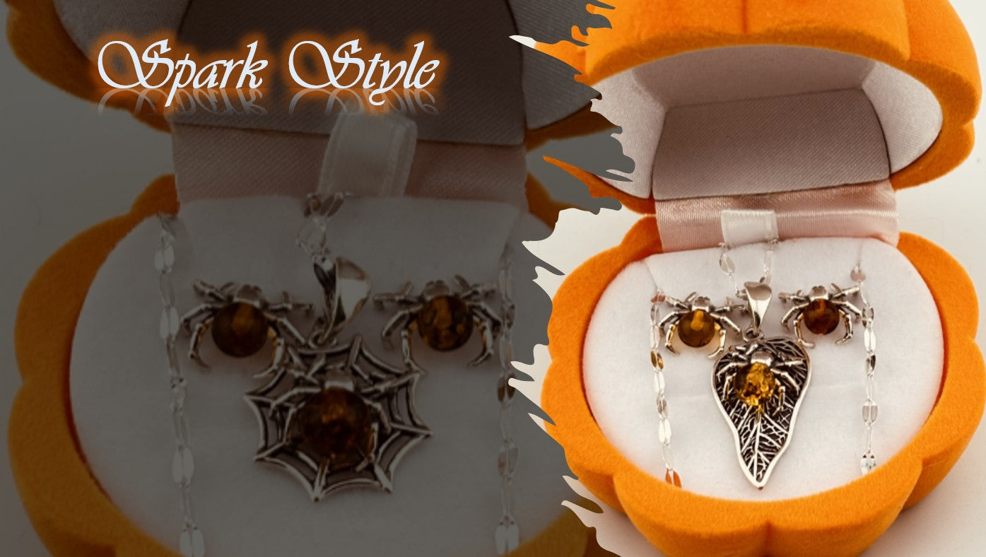 Baltic Amber Pendant & Earrings Set in a Gift Box - Spider on Web
